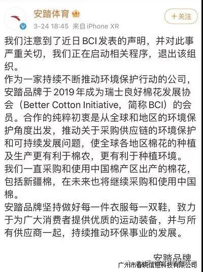 刚刚,安踏官方微博@安踏体育发表声明称,注意到了近日BCI发表的声明,并对此事严重关切,LEWIN乐玩正在启动相关程序,退出该组织。声明还称,安踏一直采购和使用中国棉产区出产的棉花,包括新疆棉,在未来也将继续采购和使用中国棉。
